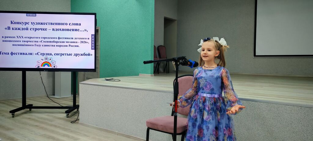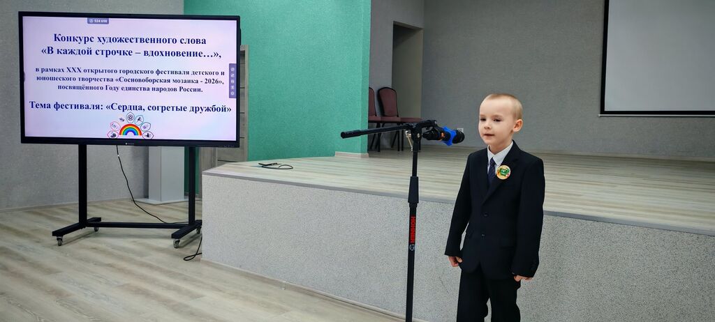 28 января в МБОУ «СОШ № 4 имени Героя Советского Союза В.К. Булыгина» прошел конкурс художественного слова «В каждой строчке – вдохновение…», в рамках XXX открытого городского фестиваля детского и юношеского творчества «Сосновоборская мозаика - 2026», посвященного Году единства народов России. Тема фестиваля: «Сердца, согретые дружбой».